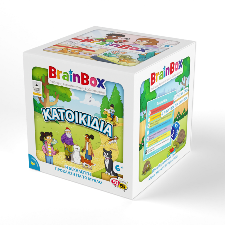Ανακάλυψε τα πιο απίθανα κατοικίδια ζώα στον κόσμο με το BrainBox Κατοικίδια! Από ράτσες γατών και σκύλων μέχρι συναρπαστικά είδη φιλικών ερπετών και ψαριών, το οικογενειακό αυτό παιχνίδι είναι εδώ για να διασκεδάσει μικρούς και μεγάλους. Διάλεξε μια κάρτα μέσα από το BrainBox. Αναποδογύρισε την κλεψύδρα και προσπάθησε να τη μάθεις απ' έξω σε 10 δευτερόλεπτα! Τώρα ρίξε το ζάρι και απάντησε στην αντίστοιχη ερώτηση. Αν απαντήσεις σωστά κρατάς την κάρτα, αν απαντήσεις λάθος βάζεις την κάρτα πάλι μέσα στο BrainBox. Σκοπός του παιχνιδιού: Μάζεψε τις περισσότερες κάρτες μέσα σε 10 λεπτά. Ηλικία: 6+ Περιέχονται: 55 κάρτες 1 κάρτα με κανόνες 1 κλεψύδρα 1 ζάρι