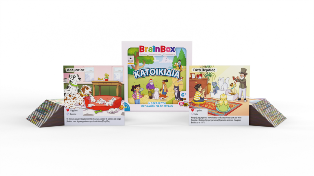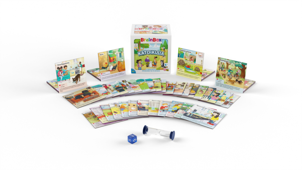 Ανακάλυψε τα πιο απίθανα κατοικίδια ζώα στον κόσμο με το BrainBox Κατοικίδια! Από ράτσες γατών και σκύλων μέχρι συναρπαστικά είδη φιλικών ερπετών και ψαριών, το οικογενειακό αυτό παιχνίδι είναι εδώ για να διασκεδάσει μικρούς και μεγάλους. Διάλεξε μια κάρτα μέσα από το BrainBox. Αναποδογύρισε την κλεψύδρα και προσπάθησε να τη μάθεις απ' έξω σε 10 δευτερόλεπτα! Τώρα ρίξε το ζάρι και απάντησε στην αντίστοιχη ερώτηση. Αν απαντήσεις σωστά κρατάς την κάρτα, αν απαντήσεις λάθος βάζεις την κάρτα πάλι μέσα στο BrainBox. Σκοπός του παιχνιδιού: Μάζεψε τις περισσότερες κάρτες μέσα σε 10 λεπτά. Ηλικία: 6+ Περιέχονται: 55 κάρτες 1 κάρτα με κανόνες 1 κλεψύδρα 1 ζάρι